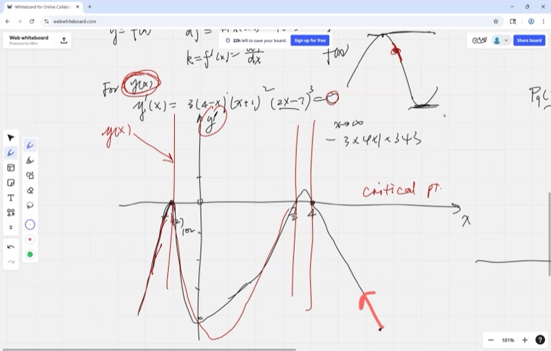 Check the sign of the derivative just before and just after a critical point. The sign change (or lack of one) tells you exactly what type of critical point you have.