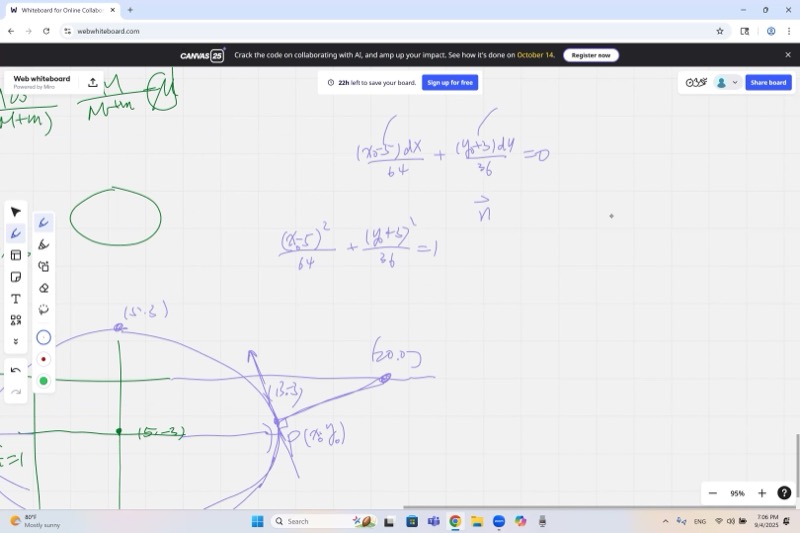 Equation 1 (point lies on the ellipse): \[\frac{(x_0 - 5)^2}{64} + \frac{(y_0 + 3)^2}{36} = 1\]