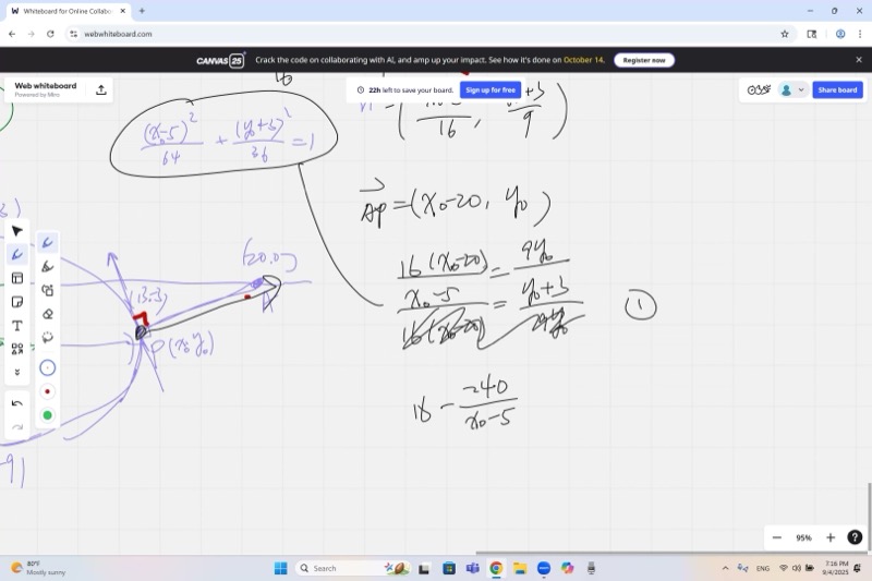 Equation 2 (normal is parallel to \(\overrightarrow{PA}\)): \[\frac{32(20 - x_0)}{x_0 - 5} = \frac{-18\,y_0}{y_0 + 3}\]