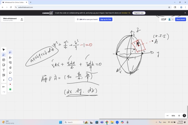 | Normal to ellipsoid at \((x_0, y_0, z_0)\) | \(\vec{n} = \left(\frac{x_0}{a^2},\; \frac{y_0}{b^2},\; \frac{z_0}{c^2}\right)\) |